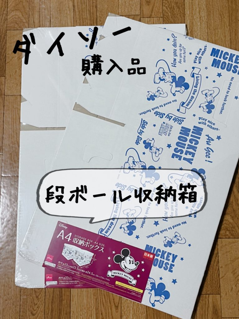 ダイソーさんで売られている段ボールの収納BOX、書類を入れたり、普段使わない物を入れたりして使っている我が家です。