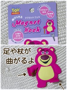 足と杖の部分が曲がるようになっていて、カギや輪ゴムなどを引っかけて使います。