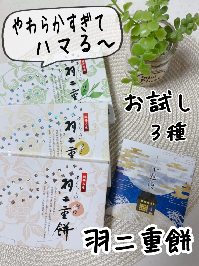 餅好きの私が気になっていたものが、こちらのあらたまの羽二重餅です。純白、きなこ、抹茶の3種類のお試しが出来るセットです。